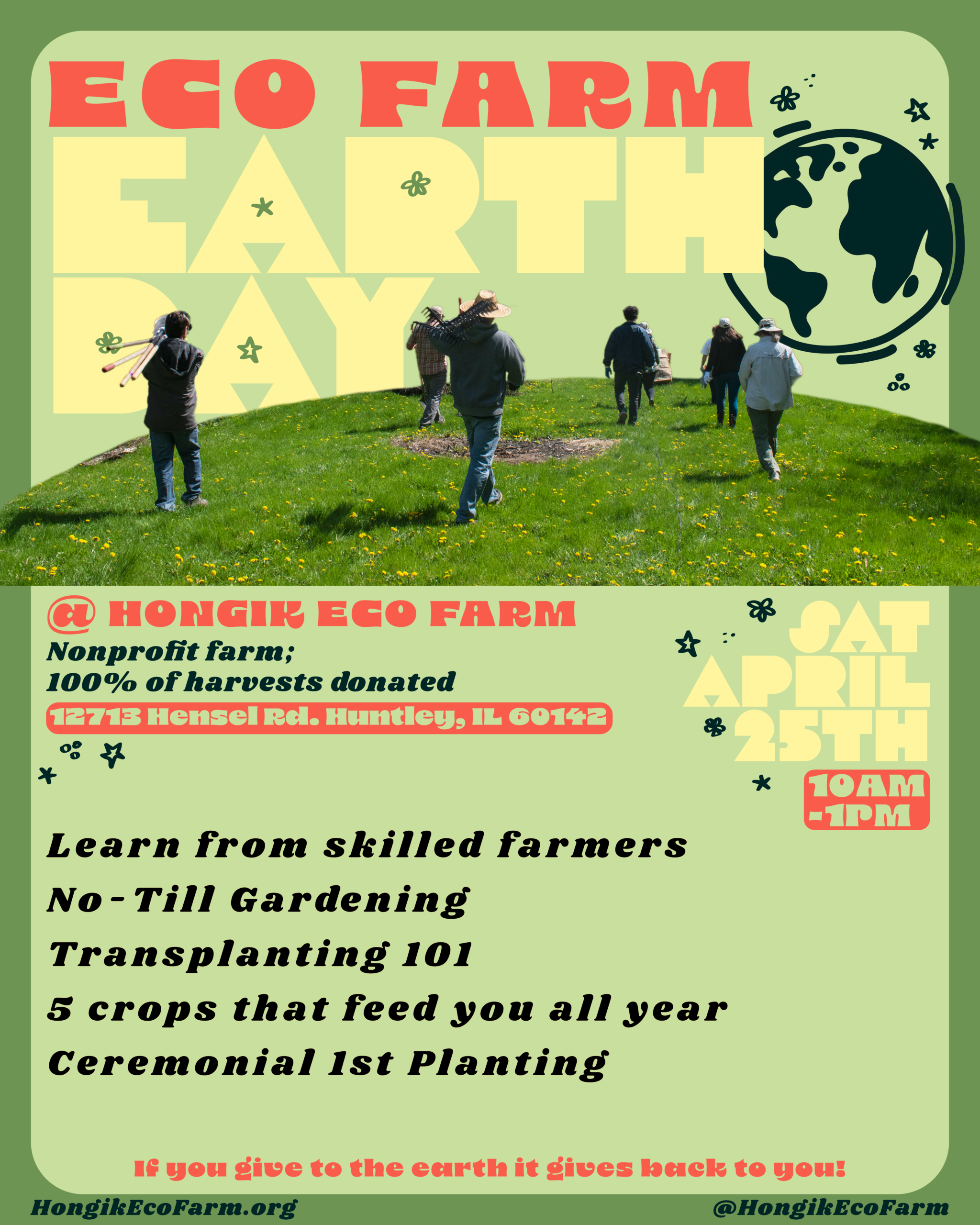 Hongik Eco Farm 2026 Earth Day Event Come join us for a fun, educational and uplifting day at our farm.  Celebrate our precious Earth, learn how to care for her while learning ways to create your own vegetable garden that will feed you all summer...